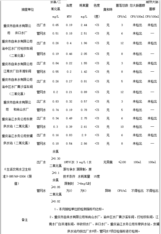 2017年1月,重慶市供水處對我市2家供水企業的7個水廠進行了水質監測。結果表明,本月抽檢單位的檢測指標均達標。重慶市自來水有限公司和尚山水廠,渝中區水廠黃沙溪車間、打槍壩車間,江南水廠白洋灘車間,豐收壩水廠、井口水廠,重慶渝江水務公司東泉供水站、安瀾供水站均按出廠水9項、管網水7項日檢指標進行檢測。