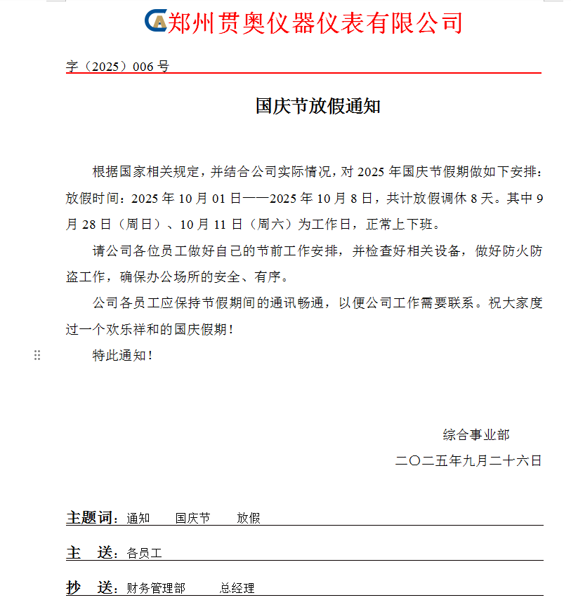 根據(jù)《國務院辦公廳關于 2025 年部分節(jié)假日安排的通知》精神,結(jié)合公司運營實際,現(xiàn)將國慶節(jié)放假、福利發(fā)放及相關事宜通知如下:
