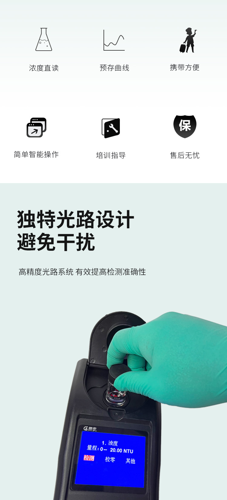 •   貫奧濁度水質檢測儀可快速準確測定地表水、地下水、城市污水及工業廢水中濁度指標,濃度直讀;可廣泛用于水廠、食品、化工、冶金、環保及制藥行業等部門。儀器是由單個的固定波長固定用途的分光光度計糅合而成的,采用分光光度法原理對各參數進行測量,在儀器中建立不同參數的濃度顯色程度與吸光度的線性曲線,儀器通過對顏色的辨別,得出被測水樣的濃度。本儀器采用全中文菜單,操作簡易易懂,使用方便快速測量準確度高。